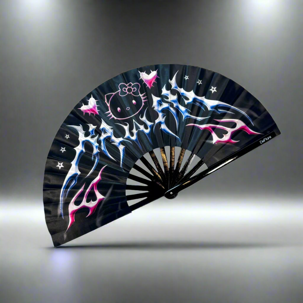 Our Chrome Kitty Rave Fan blends Y2K chrome aesthetics with bold lettering and neon pink highlights, making it the perfect statement piece for any rave fit. A bold fusion of kawaii and cyber edge, this design brings a rebellious energy to the rave scene.